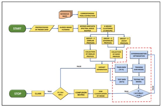 This section explains the PRISMA hyperspectral data, the region of interest, and the methods implemented in this work. Collecting in situ data for the whole island is impossible, so a procedure is proposed to prepare a dataset given one known pixel as input, referring to the maps available from regional/national portals. Samples for the dataset were generated by pseudolabelling the unlabelled pixels available in the image using the methods described in this section. This process involves guided image filtering, Jeffries–Matusita spectral angle mapper, and k-means clustering methodology. Finally, the samples generated were implemented to train the support vector machine classifier.