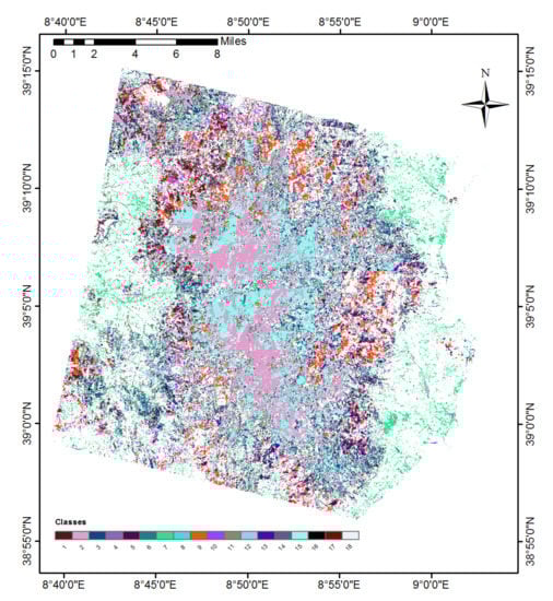 Figure 2 shows the Nature System, CLC, and grassland maps that were referred to for input and later for validation of output. Classes were mainly chosen from Nature System, and grassland maps and CLC were used to cross-check in case of any confusion in selecting the appropriate pixels. Classes are shown in Figure 2a: 1—Halophyte vegetation with the dominance of annual succulent Chenopodiaceae, 2—Matorral of evergreen oaks, 3—Matorral with olive and mastic, 4—Matorral of junipers, 5—Low olive and mastic shrubs, 6—Low shrubs (from Calicotome family), 7—Formations of Euphorbia dendroides, 8—Garrigues and meso-Mediterranean silicicole spots, 9—Garrigues and calciculous mesomediterraneal spots, 10—Arid Mediterranean meadows, 11—Mediterranean grassland (including Mediterranean and postcultural sub-Mediterranean vegetation), 12—Riparian Mediterranean ash forests, 13—Tamarisk and oleander, 14—Tyrrhenian Cork, 15—Sardinian Leccete (Holm Oak), 16—Vegetation of reeds and similar species, 17—Coniferous vegetation, and 18—Eucalyptus plantations. Figure 2b shows the CLC map with five selected classes: 311—Broadleaved forest, 312—Coniferous forest, 313—Mixed forest, 321—Natural grasslands, and 323—Sclerophyllous vegetation. Figure 2c shows the pixels covered by grasslands, especially in urban areas.