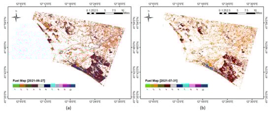 Further details about the mission and products are available in the PRISMA products specification document. Level 2C was considered for the fuel mapping, whereas the level 1 product provides a basic land cover map with classes, viz., water pixel, snow pixel, bare soil, cropland, forest, wetland, and urban component used to classify vegetation pixels from nonvegetated pixels, as shown in Figure 4a. Thus, the processing time was reduced by applying the proposed procedure only to vegetation areas.