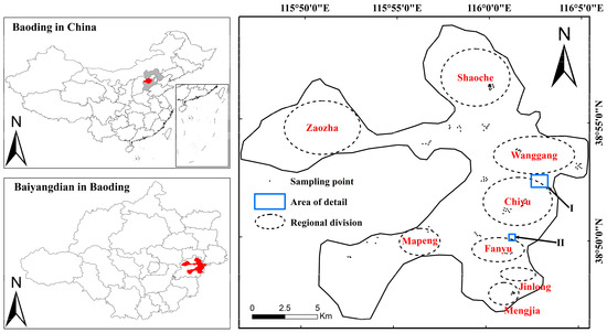 Baiyangdian (BYD) is the largest shallow lake in China’s Haihe River Basin, formed in the depression where the Yongding River and Hutuo River alluvial fans meet in front of the Taihang Mountains. We collected 92 water samples from BYD lake, accounting for eight oval-shaped regions (Figure 1), to calculate changes in Chl-a concentrations over time. We also selected two smaller rectangular regions (Figure 1 details areas I and II) to verify the STF results at fine scale, including the water quality correction algorithm and changes of water quality with time.