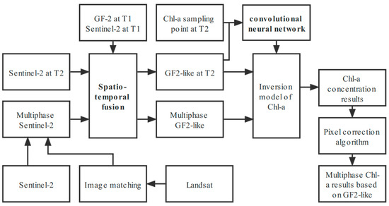 The flow of this paper is shown in Figure 2. In this study, firstly, GF2-like images of the sampling period were generated using spatio-temporal fusion, and a Chl-a inversion model based on a convolutional neural network was established using the sampling points and images as input data. Then, the Sentinel-2 sequence was supplemented using the image-matching algorithm. Spatial and temporal fusion and water quality inversions were performed on multi-period Sentinel-2 data to generate preliminary water quality results. Finally, the corrected GF2-like-based Chl-a concentration time series were generated using the pixel correction algorithm.