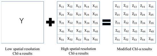 - The unified up-sampling of high- and low-resolution Chl-a results of the same period to 2 m resolution is performed, and each set of 5 × 5 low-resolution pixels was homogenized to generate the corresponding confused pixel Y, whose expression is:where is the low-resolution image pixel after resampling.