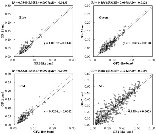 Figure 9 shows the scatter plot of the DN (digital number) range of different bands based on the GF2-like image and GF-2 image for 16 August 2019. Benefiting from a larger DN range, the correlation in the NIR band was the best with an R2 of 0.8812, and the correlation in the visible band was generally lower than that in the NIR band. The differences between the bands of fused GF2-like images and the GF-2 image were kept roughly within the absolute errors around −0.02. Consistent with the observation of the box line plots, the DN of GF2-like images is slightly lower than that of Sentinel-2.