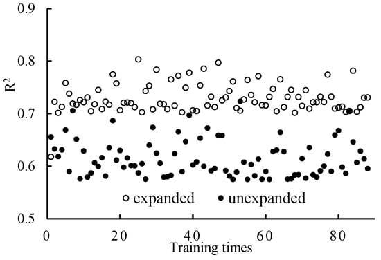 Figure 10 shows the corresponding correlation level when the training input data are expanded (i.e., when we rotated and flipped the training data to increase the number; see Figure 5) or unexpanded. When the model uses extended data, the average correlation level increases by about 0.1, the correlation degree is generally greater than 0.7, and the highest can reach 0.803.