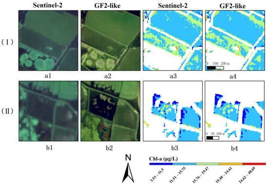 Detailed information, including image STF result and retrieved Chl-a in region I and II for 21 August 2019 ((a1) region I of Sentinel-2, (b1) region II of Sentinel-2, (a2) region I of GF2-like, (b2) region II of GF2-like, (a3) Chl-a result of region I of Sentinel-2, (b3) Chl-a result of region II of Sentinel-2, (a4) Chl-a result of region I of GF2-like after pixel correction, (b4) Chl-a result of region II of GF2-like after pixel correction).
