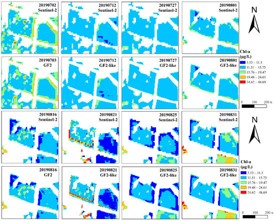 Figure 13 shows the correlation curve for the Chl-a inversion results of the Sentinel-2 images and GF2-like images. It can be seen that all inversion results had a higher correlation (R2 > 0.81) with good reliability. The difference between STF images and low-resolution images ranges from 0 to 6 μg/L. The sample points are shifted to the upper right corner on 21 August, 25 August, and 31 August, indicating a significant increase in Chl-a during this period.
