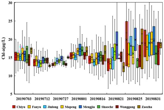 Figure 16 shows the comparison of Chl-a concentrations in the eight areas of BYD lake (Figure 1). We plotted the mean and range of 1000 points from each area for eight consecutive dates. We found that there was a slight decrease in Chl-a concentration in BYD lake during July, and the regional differences gradually decreased. During August, Chl-a concentrations increased at different degrees in all regions, and the range of values in the region became wider, indicating that there was a great variation in algal growth in August, and algal outbreaks occurred locally in BYD lake. Overall, the Chl-a concentration in BYD lake was greater in August than in July, with the highest value greater than 30 μg/L throughout August and a high degree of eutrophication, and the lowest Chl-a concentration in late July, with concentrations ranging from 10 to 15 μg/L.