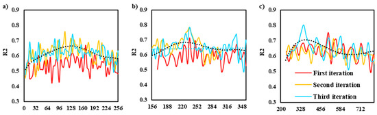 Many scholars have tried to construct water quality inversion models with CNN and achieved good results, for example, Maier et al. used a 1D CNN for Chl-a simulation training [56], and Aptoula et al. used a 2D CNN and a 3D CNN for Chl-a simulation training, where the R2 reached 0.93 [57]. We used a 2D CNN for training in our experiments, and Figure 17 shows the effect of the number of convolutional kernels per layer on the effect of the model, and the accuracy curves for the first three iterations are plotted in the figure. We found that as the number of iterations increased, the accuracy of the first and second layers improved significantly, while the accuracy of the third layer improved less. Pu et al. concluded that the optimal number of convolutional kernel layers for inverse water quality grading in convolutional neural networks is two to seven layers [55], which is consistent with our observation. We finally determined the CNN structure as 4-(136-236-340)-1-1, the learning rate was set to 0.001, the number of iterations was set to 100, and the regularization parameter was set to 0.001. Its correlation coefficient R2 reached 0.803. This accuracy level is normal because the wide spectral bandwidth of GF-2 images weakened the spectral features [58]. We trained with Sentinel-2 images under CNN and found that its best correlation coefficient R2 reached 0.887, which is similar to the accuracy level of the related study [59].