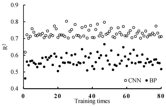 The CNN-based Chl-a inversion model can effectively reflect the rich spatial information of the fused images and obtain high spatial resolution Chl-a inversion results [60]. Figure 18 shows the correlation level between BP (backpropagation) and the CNN, and the accuracy of the CNN is higher than BP when there are enough samples [61]. The CNN takes full advantage of the high-resolution features of the fused images and reduces the unexpected errors caused by the small field of view of traditional inversion methods [38,62].