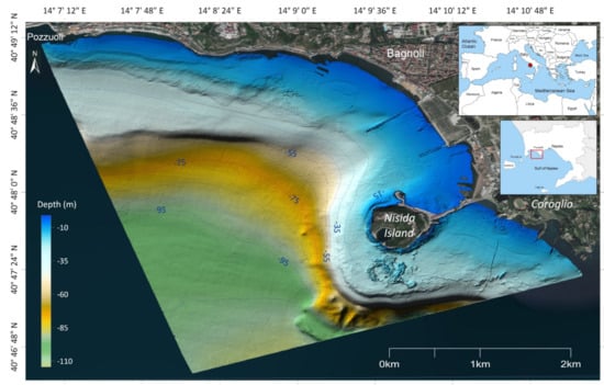 The data acquisition of this study area was carried out in 2017 by CNR–ISMAR Naples (formerly CNR–IAMC), within the framework of the ABBaCo Project (Italian project ‘Restauro Ambientale e Balneabilità del SIN Bagnoli–Coroglio’—pilot experiments for the environmental restoration and bathing possibility of the Bagnoli–Coroglio coastal area) coordinated by the SZN-Anthon Dohrn, Naples. The project was designed to produce new approaches addressing the remediation of contaminated sites and restoration of marine habitats [,]. The study area (Figure 1) was located in the eastern Gulf of Pozzuoli (Naples, southern Italy) and is an integral component of the Campi Flegrei volcanic system, located in the Campania region [].