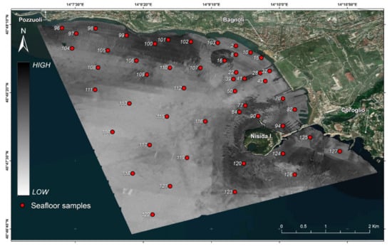 The marine area of the Bagnoli coastal zone is part of the caldera collapse that originated from the eruption of the Neapolitan Yellow tuff []. The infralittoral setting is characterized by relatively coarse-grained sediments, mainly sand and silty–sand, representing the grain size distribution in equilibrium with a shallow–water, high-energy environment. The sediment constituents are mainly formed by bioclasts and volcaniclasts with a sandy–silt matrix that becomes more abundant towards the distal sector of the gulf []. The Bagnoli area has undergone intense industrial activity during most of the last century, from the 1910s until the 1990s. Human-related activities altered the original morphology of the coast, e.g., for the construction of infrastructures on both land and at sea. Steel production ultimately ended in 1990, and the industrial facilities were completely dismantled in the early 2000s []. Since then, a series of surveys were carried out with the aim of providing a characterization of soil on land and marine sediments offshore, addressed to the environmental recovery of the area (e.g., [,,,]). With the ABBaCo project, new results were obtained aimed at the acquisition of new and updated data [,,,,,,]. Similarly, a high-resolution shaded image derived from bathymetric data (Figure 1) and acoustic mosaic from backscatter data (Figure 2) were obtained, covering about 16 km2 in a water depth range of 1.5–115 m bsl.