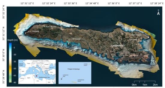 Location map of Lampedusa Island and bathymetric map of area acquired in 2015 (2.5 × 2.5 m pixel resolution, after []).