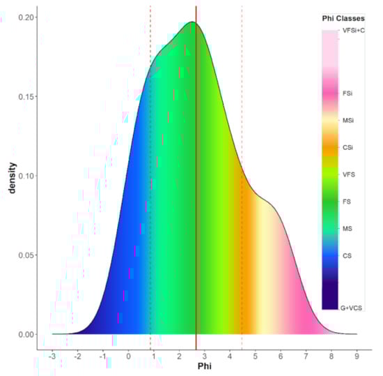 We used the granulometric distribution values derived from the 50 ground-truth samples collected in Bagnoli to calibrate our model. In detail, the different percentages of sediments belonging to each particle size class (from the coarse to the finest) were used to calculate the mean value of the phi scale using the ‘gran.stats’ function of the ‘rysgran’ package []. Phi is a logarithmic parameter for grain size classification whose values range from −9 (i.e., boulders) to 9 (i.e., clay) and is calculated as: