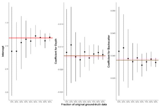 The results from the sensitivity analysis can be seen in Figure 8. The results showed that, even with a sample size as low as 40% of our original dataset, all model parameters (i.e., intercept and coefficients for depth and backscatter) converged on the results of the full model, albeit with some variability resulting from the 50 random replicates with each subsample. Thus, considering that the area of Bagnoli was 16 km2 and that we took 50 ground-truth samples, we could have reached similar results with only 20 ground-truth samples. Consequently, 1.3 ground-truth samples per km2 would be a viable trade-off for validating and/or calibrating our modeling approach in other areas. Accordingly, for the area of Lampedusa, for instance, the results from our model could be validated by 24 ground-truth samples, as the overall surveyed area was approximately 18 km2.