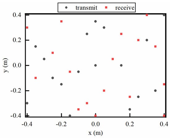 Let us consider an array system in the Cartesian coordinate system with N transmitting elements and M receiving elements (N = 17, M = 17). The coordinates of the n-th element (n = 1, 2, …, N) and the m-th element (m = 1, 2, …, M) are (xn, yn, zn) and (xm, ym, zm). More specifically, the array elements are randomly arranged in the z = 0 plane. The minimum distance between two adjacent elements is ∆xmin = ∆ymin = 5 cm. The array structure of the imaging system is shown in Figure 1 and the coordinates (x, y, 0) of each element are shown in Table 1. The z-axis direction represents the range direction, and the x-axis and y-axis denote the horizontal and vertical cross-range dimensions, respectively.
