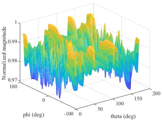 As reported in [38], the average transmitting pattern of an array radar system can be derived as Equation (20), where denotes the power spectral density matrix of transmitted signals at frequency f, represents the transmit steering vector, and φ and θ represent the azimuth and elevation, respectively. The simulated average transmitting pattern is shown in Figure 2. The amplitude value of the normalized transmitting pattern varies between 0.97 and 1 (−0.13 dB~0 dB). Therefore, the transmit array can scan the space almost uniformly. In other words, the employed array can scan space without phase-shifters or rotating antennas.