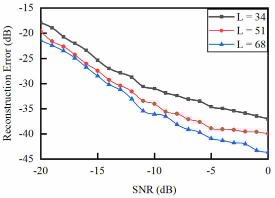 To evaluate the imaging performance of the proposed system, we refined the spatial discrete grid into ∆z = 1 cm, ∆x = ∆y ≈ 2 mm. Then, 100 Monte Carlo experiments were performed under each signal-to-noise ratio (SNR) condition. In each imaging simulation experiment, we randomly generated a point in the observation area as the target. Both the coordinates and reflection coefficients of the point target were random. The obtained reconstruction error vs. SNR curves are shown in Figure 3. The reconstruction error curves show that the applied system can unambiguously estimate target location. With the improvement of SNR conditions, the smaller the reconstruction error of the system, the closer the imaging results are to the ideal result. If more frequency points are selected, the system will achieve lower reconstruction error and better anti–noise performance.
