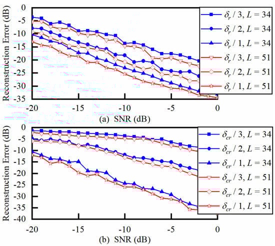 Unlike conventional imaging methods, we cannot use the point spread function to analyze the main lobe width in imaging results directly. In this letter, we use reconstruction errors to indirectly analyze the imaging performance of the designed system. The specific method is as follows: randomly generate two adjacent points in the observation space as targets, and judge whether the proposed method can effectively distinguish and accurately reconstruct these targets by calculating the reconstruction error. We first analyze the minimum range resolution interval of the system. Taking the range resolution δr determined by Equation (1) as a reference, the reconstruction errors of targets at different intervals are shown in Figure 4a. If the reconstruction error is less than −10 dB, the system can be considered to have good imaging performance, that is, it can successfully distinguish these targets. It can be seen that when the selected frequency is unchanged, the larger the target interval, the easier it is to distinguish. The better the SNR condition, the easier it is to distinguish adjacent targets. When L ≥ 51 and SNR ≥ −14 dB, the reconstruction error of the system to adjacent targets separated by 1/3δr = 1 cm is < −10 dB. Hence, the minimum range resolution interval is one-third that of conventional methods. Then, we analyzed the minimum resolution interval of the system in horizontal and vertical directions. With reference to δcr determined by Equation (1), when target intervals are δcr/3, δcr/2, and δcr, reconstruction errors are shown in Figure 4b. When the target interval is equal to δcr, the system can choose fewer frequency points to achieve low-error reconstruction. The reconstruction error will decrease as the SNR increases or the selected frequency points increase. When L ≥ 51 and SNR ≥ −10 dB, the minimum cross-range resolution interval that can be achieved is half of that of conventional methods.