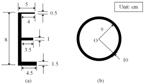 Then, we performed imaging simulation on targets with multiple scattering points. The shape of each target is shown in Figure 5. Target (a) is “E”-shaped, and the size of each part has been marked. Target (b) is a ring with an outer diameter of 10 cm and an inner diameter of 9 cm. These targets are located in the z = 1 m plane, and SNR = 0 dB. Normalized imaging results at L = 51 are shown in Figure 6. The spatial pixel sizes in the z = 1 m plane are 5 mm × 5 mm (Figure 6a) and 2 mm × 2 mm (Figure 6b). Figure 6a,b share the same color bar, as shown on the right side of Figure 6b. The imaging result of target (a) has some noise points with a maximum value of −34 dB, which hardly makes it difficult for us to identify the target. The reconstruction error is −18.66 dB, and the imaging result almost accurately reflects the target contour and the size of each part. Since the method uses discrete space in pixel arrays, the imaging effect of curved contours, as shown in Figure 6b, is not as realistic as that of linear contours. Compared with Figure 6a, the noise in Figure 6b is more obvious, with a maximum value of −18.12 dB. Nevertheless, we can still identify targets’ contour and size.
