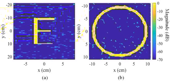 Imaging results of targets shown in Figure 4: (a), imaging result of the “E”-shaped target; (b), imaging result of the ring target.