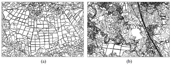 Very High Resolution (VHR) images can be used for mapping cropland fields of smallholder farms in large geographical areas. In general, edge detection, deep learning and object-based image analysis (OBIA) are the main approaches for extracting cropland fields using VHR images. When an object is the basic spatial analysis unit rather than a pixel, salt-and-pepper effects can be avoided. Edge detection is performed by setting filters to detect pixels with significant brightness changes, such as with the Canny operator [8] and the Sobel operator [9]. However, these operators are sensitive to noise and are only suitable for images with less noise and less complexity. The convolutional neural network (CNN) [10,11] is the most commonly used deep learning method for extracting cropland fields. CNN-based methods have achieved promising results in multiscale and multilevel feature learning from remote sensing images [12]. However, these methods typically require large amounts of training data to obtain the desired results. It is typically difficult, time-consuming and expensive to collect, label and process a large volume of training data in many domains. Multiresolution segmentation (MRS) is an object-based segmentation method that has achieved excellent results for delineating cropland fields in different regions [13,14]. It merges adjacent objects into larger objects with minimal spectral and spatial heterogeneity variation. MRS obtains segmentation results in regions of varying complexity without training samples.