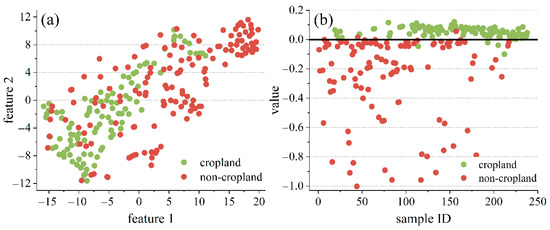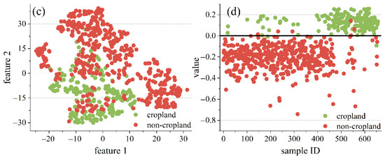 The two classes of the original features and the probability of GP classifiers are visualized in scatter plots (Figure 11). The original features were reduced to two dimensions using t-Distributed Stochastic Neighbor Embedding (t-SNE) [45]. The t-SNE method is a well-known and commonly used technique for dimensionality reduction and visualization. It is used to transform high-dimensional datasets into low-dimensional spaces and typically achieves better visualization results than other methods [45]. The best individual obtained by GP calculated the probability of samples and split it by a threshold of 0. In the two areas, Figure 11a,c show different classes that are highly mixed, making it difficult to distinguish a cluster. In contrast, Figure 11b,d show clearer clusters of the GP classifiers, and fewer points are clustered into the wrong classes. This indicates that the new classifiers constructed by GP eliminate the noise in the original features and make it easier to extract cropland fields.