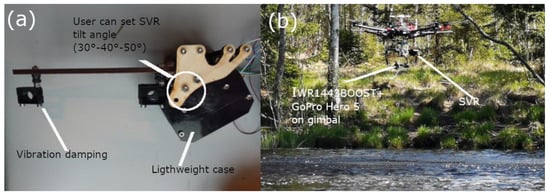 The SVR is produced with a large case and heavy mounting brackets (which are used to set different mounting angles). The system was readapted to make it suitable for UAS deployment, specifically: (i) the case and mounting brackets were removed and substituted with a lightweight case, (ii) a new mounting bracket was designed to allow the user to set 3 different sensor tilt angles, (iii) vibration damping was provided to decrease the effect of high-frequency vibrations caused by the drone. The UAS-adapted version is shown in Figure 1a.