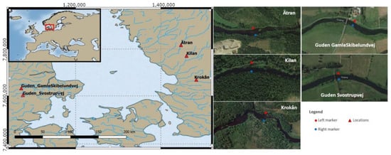 Map with the location of the different sites in Sweden and Denmark with detailed satellite images of the sites. Coordinate reference system is WGS84/Pseudo-Mercator. Source for the left-panel map is https://www.naturalearthdata.com/ (last access 3 January 2022), river outlines are from https://www.diva-gis.org/gdata (last access 3 January 2022), and the sites images are from https://www.google.com/earth/index.html (last access 3 January 2022).