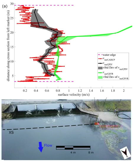 Guden_Svostrupvej XS (DK). (a) surface velocity plot comparing ADCP measurements of surface velocity (vsurf,ADCP), UAS-borne PIV (vsurf,PIV) and UAS-borne SVR (vsurf,SVR). SVR and PIV are represented with shaded grey (PIV) and shaded green (SVR) to present standard deviation (±Std Dev). (b) shows a UAS-borne video frame with also a red point indicating where the left marker was placed (North arrow, approximate flow direction and approximate scale are also shown).