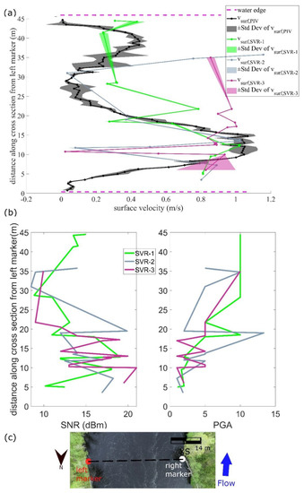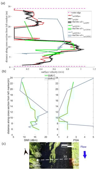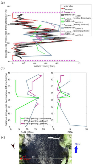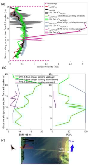 The PIV shows a good correlation compared to the surface velocity measured with MFpro. On the right streambank, the standard deviation (Std Dev) is rather high, which is caused by the high spatial variability along the river course, mainly caused by aquatic plants (also visible in the picture of Figure 5c). Static SVR tests were performed from the bridge by holding the SVR static; to obtain the velocity profile, the system was moved from one position to the other (at intervals of ca. 1 m) across the XS (with the system standing for 2 min at each position). Figure 5a shows the static test results for both the tests in which SVR pointed upstream and downstream. Because the upstream and downstream tests were conducted from the two sides of the bridge, the actual water surface area measured by the SVR footprint was different between the two tests, thus, surface velocity may slightly differ between the two cases. Both of these tests show a good agreement with MFpro. The test in which the SVR was pointed upstream shows better results (in terms of velocity comparison with ground-truth) than the downstream-looking test, especially in the center of the XS and on the left side. The advantage of pointing the SVR upstream is also shown by the SNR values (significantly higher in the upstream-looking test). The downstream-looking test observed a SNR < 7 on the right side of the XS (after ca. 20 m distance from left marker), thus those observations are omitted (as described in the Materials and Methods section regarding SVR filtering parameters). In contrast, the upstream-looking test shows a very high SNR value (ca. 20) at 20 m from the left marker and a sharp decline of SNR towards the right marker: the velocities detected in the upstream-looking test are inaccurate in the part of the XS after 20 m from left marker.