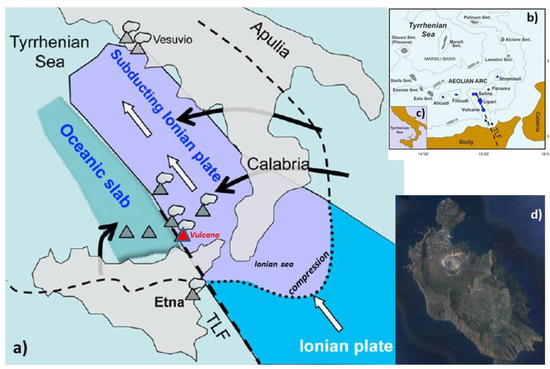 (a) Geodynamic setting; (b) Aeolian Archipelago sketch map; (c) South Italy map, modified from Peccerillo et al. 2013; (d) Vulcano Island image from Google Earth.
