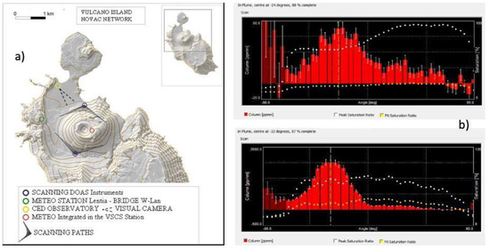 (a) UV scanning DOAS and conic scanning path; (b) two examples of the distribution of the plume on two measurements made under conditions of different degassing activities. The graphs were produced by the NOVAC software and show the positions of the telescope during a single measurement, from 90° to −90° (X axis; horizon to horizon) for a total of 50 positions for one complete measure, and the column density of SO2 (Y axis; ppmm). The white dots represent the peak intensities of the light, and the red bars the column density for each position of the telescope during the measurement. (a) Measurement during 2020 (normal activity, ca. 14 t d−1). (b) Measurement on 12 October 2021 (increased activity, ca. 140 t d−1).