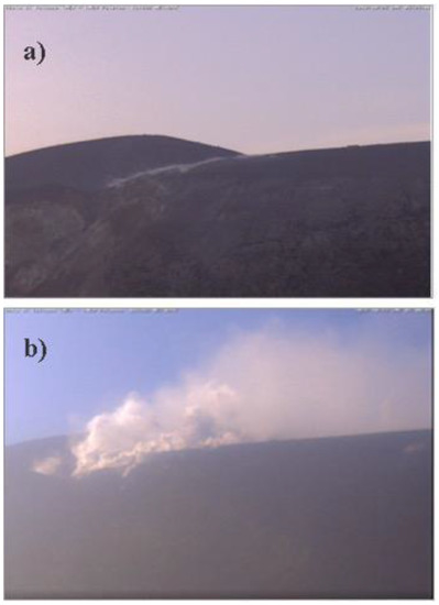 Photos of the Vulcano crater obtained by video monitoring. (a) View of the fluid emission from the main fumaroles field during the period of background solfataric activity degassing; (b) view of the fluid emission from the main fumaroles field during the anomalous degassing of 2021 crisis.