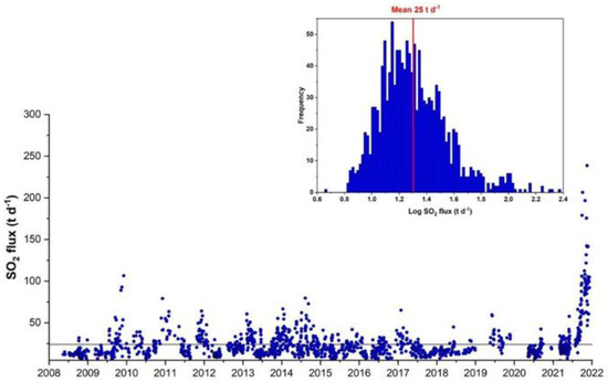 Daily average of SO2 fluxes from the volcanic plume of the 2008–2021 period. Histogram of the SO2 fluxes data with a mean value of 25 t d−1.