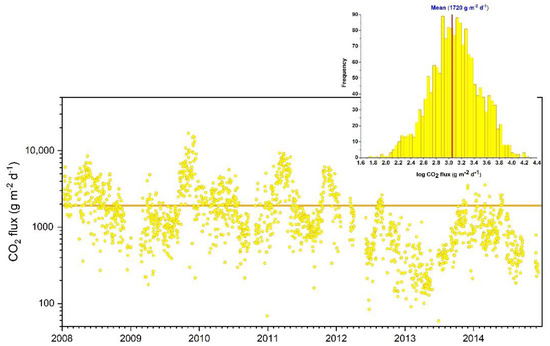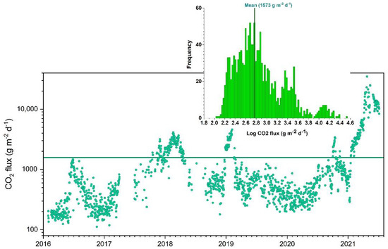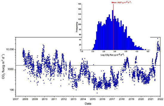 Daily average (24 measurements/day) of CO2 fluxes of VSCS station of the 2007–2021 period. Histogram of the CO2 fluxes data with a mean value of 1637 g m−2 d−1.