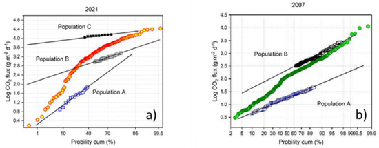 (a) Log CO2 fluxes vs the cumulated probability (%) of the 2007 survey; (b) Log CO2 fluxes vs the cumulated probability (%) of the 2021 survey. Both surveys were performed at the summit area.