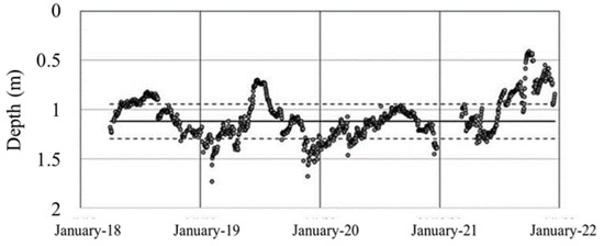 Time variation of the depth limit of the conductive layer recorded at VSCS station. The dashed lines indicate the standard deviation around the average value, evaluated during the period of background diffuse degassing (June 2018–June 2019).