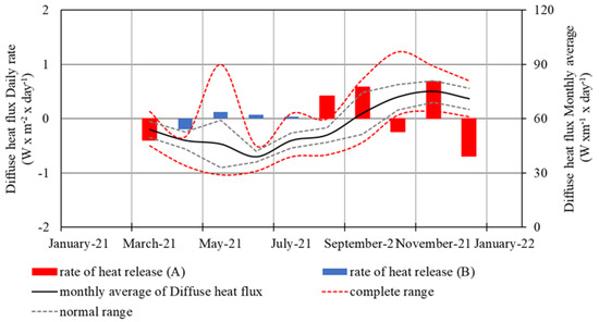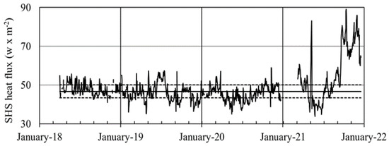 where t4 and t2 are the temperatures, measured along the shallow vertical profiles at different depths (zt4 = −0.6 m; zt2= −0.3 m) and λ is the thermal conductivity, which, in the dry ground conditions requested for SHS flux evaluations, is assumed to be constant for a specific site (in this case we applied the value λ = 0.8 W· m–1·K–1, in accordance with [37,38,39,40,41,42,43,44,45,46,47,48,49,50,51,52,53,54,55,56,57,58,59,60,61,62,63,64,65,66,67,68,69,70,71,72,73,74]). In order to minimize the sun radiation effect, the SHS-Flux was calculated based on the temperature gradient, excluding the uppermost sensor of temperature (T1 at depth of 0.15 m). When/if the temperature of the sensors in the ground increases to more than 70 °C, the temperature gradient is no more linear and the convective component of the heat flux becomes dominant. In this case, steam is the main component in the porous ground, and the monitored layer loses the ideal dry condition requested for the total conductive heat transfer. When the ground temperature of the monitored profile is higher than 70 °C, the SHS monitoring system can still supply the real start and end time of the increased heat release, but in this instance, the evaluated heat flux is highly underestimated, not including the convective heat transfer, that is—temporary—the main component of the local heat flux.