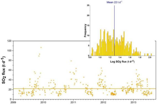 Moreover, after the anomalous degassing in 2009, SO2 flux underwent a progressive decrease from 104 t d−1 down to 40 t d−1 in 2014, showing for this sub-period the average value of 24 t d−1 (Figure 13).