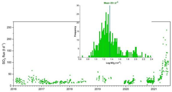 Daily average of SO2 fluxes from the volcanic plume of the 2016–2021 period. Histogram of the SO2 fluxes data with a mean value of 29 t d−1.