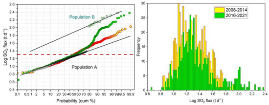The behavior of the two sub-periods is better visualized by GSA, as shown in Figure 15 and in Table 3. In detail, the 2008–2014 period was characterized by a unimodal distribution of degassing families, while the 2016–2021 period has been characterized by the bimodal distribution with two different degassing families with frequencies of 86% and 14 %, respectively.