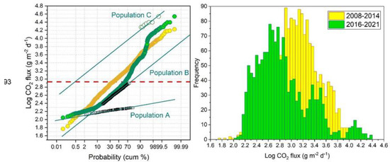 The probability plot resulting from the flux measured in the last survey (Figure 10a and Table 1 and Table 2) shows a three-modal distribution, consisting of three lognormal populations named A, B and C, with a partial overlapping of the samples in (A) and (B). Based on the GSA technique proposed by [69], the mean CO2 flux and the 95% confidence interval of the mean [74] are for the population (A) 606 g m−2 d−1 (336–1679 g m−2 d−1); for the population (B) 1343 g m−2 d−1 (1150–1629 g m−2 d−1); and for the population (C) 13,518 g m−2 d−1 (12,816–14,789 g m−2 d−1).