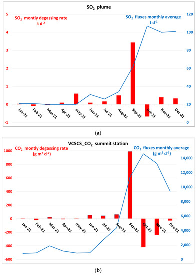 The second sub-period, from 2016 to 2021, has been characterized by the average value of 29 t d−1, a generally more sustained outgassing, and several small anomalies in 2016, 2018 and 2019, showing values exceeding 50 t d−1. Finally, the strongest increase in the convective degassing has begun in April 2021 and reached values up to 250 t d−1, an order of magnitude higher than the average value in September–October 2021 (Figure 14).