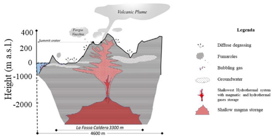 The presence of a magmatic chamber below the La Fossa cone is required to account for the time variations of diffuse degassing registered in the area and the whole volcanic edifice forming the island of Vulcano rises from the local sea floor (about 1000 m b.s.l.) up to the maximum height of 499 m a.s.l. at Monte Aria [45]. The Island consists of overlapping volcanic edifices whose formation began at 120 ka [43,48,49]. The volcanic system comprises the Primordial Vulcano edifice (120–100 ka), dissected by the development of Il Piano caldera that lasted until around 100 ka before the present and subsequently by the La Fossa caldera (dating back from 80 to 15 ka before the present [48,50]. In the last 15 ka, new eruptive vents were activated in the northern sector of the island, developing in a N–S direction. The two most recent volcanic structures are the La Fossa cone, the active volcanic center developing the stratocone that started to erupt around 5.5 ka b.p., [51] and Vulcanello, the small volcanic peninsula in the northern part of La Fossa caldera. The Vulcanello peninsula, showing three coalescent crater rims, is composed of a lava platform and three partially overlapping scoria cones aligned NE–SW along the northern ring fault of La Fossa caldera [52]. The presence of a magmatic chamber below the La Fossa cone is required to account for the time variations of diffuse degassing registered in the area and is also suggested by the high geothermal gradients measured in the Agip boreholes [53]. Different geophysical and geochemical evidence accounts for the evaluated depths of magma storage. These two different approaches agree with indicating a multibaric and multi-thermal plumbing system during the entire life of Vulcano, and in identifying the different magma storages at about 20 km of depth at 13–8 km and 5–3 km, as well as the shallowest storage system zone, indicatively located about 1–2 km beneath the La Fossa cone [42]. The magmatic intrusion located 1–2 km of depth, and the magmatic storage at about 5–3 km, have been strongly influencing the shallow hydrothermal system, feeding the fumarolic field of the Grancratere of La Fossa, during the historical observation period.