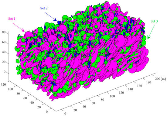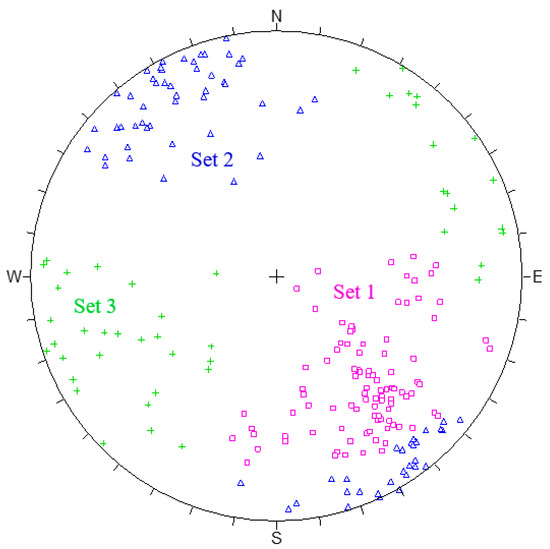 Based on the fracture orientation data, an improved fuzzy C-means (FCM) method introduced by Song et al. [23] and is utilized to identify the fracture sets. Rock masses are characterized by three discontinuity sets, as shown in Figure 5.