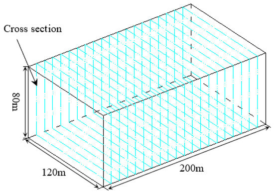 To facilitate the search for the slip surface of the slope, a series of cross-sections are set within the 3D fracture network model. These cross-sections are perpendicular to the x-axis and arranged at x = 10 m, 20 m, …, 190 m (Figure 7).
