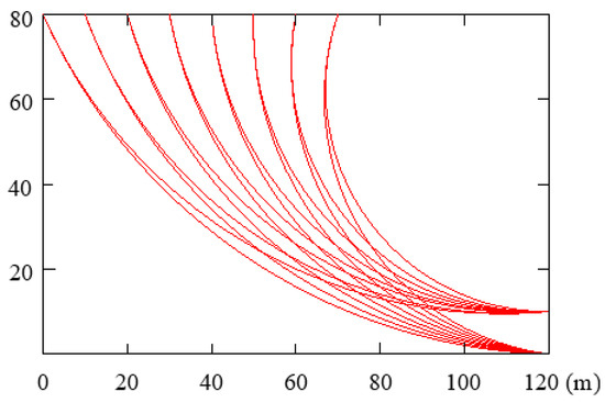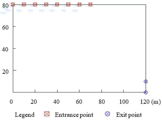Generally, the shear exits and entrances are arranged around the deformation position at the front and back edge of the slope. In this study, the coordinate points (0, 80), (10, 80), (20, 80), (30, 80), (40, 80), (50, 80), (60, 80), and (70, 80) are separately chosen as the candidate shear entrances and the coordinate points (120, 0) and (120, 10) are separately chosen as the candidate shear exits (Figure 8). With an arbitrary combination of a shear entrance and shear exit, 16 search combinations of the entrance and exit can be formed. Using the Floyd algorithm for searching the shortest path, 16 of the shortest paths are determined. Taking the cross-section of x = 20 m as an example, the two combinations of the entrance point (0, 80) and the exit point (120, 0), the entrance point (70, 80), and the exit point (120, 10) are separately listed. The shortest paths searched corresponding to the above two combinations are separately shown in Figure 9.
