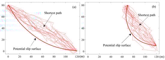 The potential slip surface between the designated shear entrance and exit; (a) Entrance point (0, 80) and exit point (120, 0); (b) Entrance point (70, 80) and exit point (120, 10).