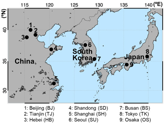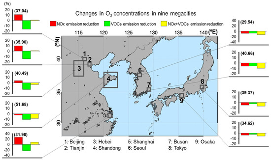 Ozone (O3) is increasing in East Asia at a higher rate because of the rapid industrialization and urbanization over the years, and has been regulated since the 2000s in East Asian countries [1,2,3,4]. In China, total nitrogen oxides (NOx = NO (nitric oxide) + NO2 (nitrogen dioxide)) have been on a downward trend since 2013 due to China’s implementation of China’s Five-Year Plan (FYP) air pollution control policies during 2013–2017 [1,2]. South Korea has enforced stringent regulation policies for NOx since the early 2000s [3,4], and in Japan, O3 reduction measures have been imposed to reduce traffic emissions since the 1990s, resulting in the reduction of volatile organic compounds (VOCs) and NOx emissions, which have decreased by 50% and 54%, respectively [5]. Nevertheless, a persistent increase in ground-level O3 has been observed in many areas of East Asia [5,6,7]. Studies on the impacts of O3 regulation and emission reduction policies have been conducted targeting O3 abatement over East Asian megacities, including the Pearl River Delta region [8], Hebei Province, [7,9], and Yangtze River Delta region [10] in China, and several megacities in Japan and Korea [11,12]. These studies have shown non-linear changes in response to the reduction of urban emissions.