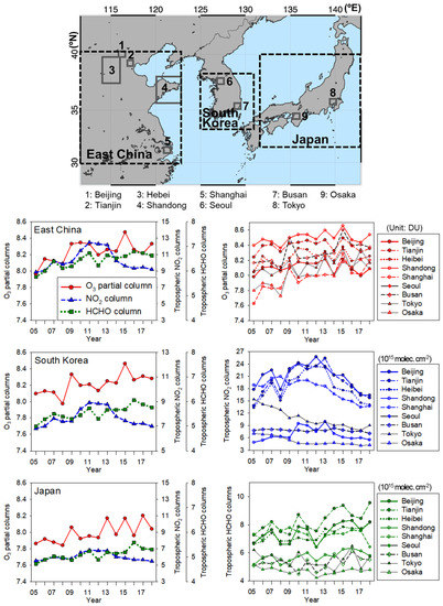 Three sub-divided analysis areas: East China, S. Korea, and Japan, including nine megacities (as defined in Figure 1) and time series of the O3 (900–700 hPa) (unit: Dobson Unit), tropospheric NO2 (unit: 1015 molecules cm−2), and HCHO (unit: 1015 molecules cm−2) columns for 2005–2018. Rectangular boxes represent the sizes of the nine megacities for the OMI column averages.